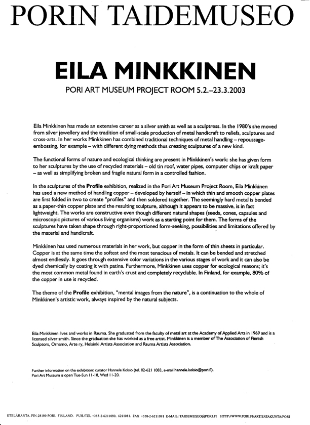 An Internet search for "repoussé copper" or "repoussage" yields nothing in the Finnish language. But these are precisely the terms that are used when speaking of Eila Minkkinen's sculpture. Minkkinen is by training a silversmith, but she began branching out of jewellery-making into sculpture back in the 1970s - on occasion even earlier. Ever since moving to Rauma in 1980, she has increasingly become a sculptor, though jewellery-making has time and again made a potent comeback into her life. She has been a member of the Association of Finnish Sculptors since 1986.